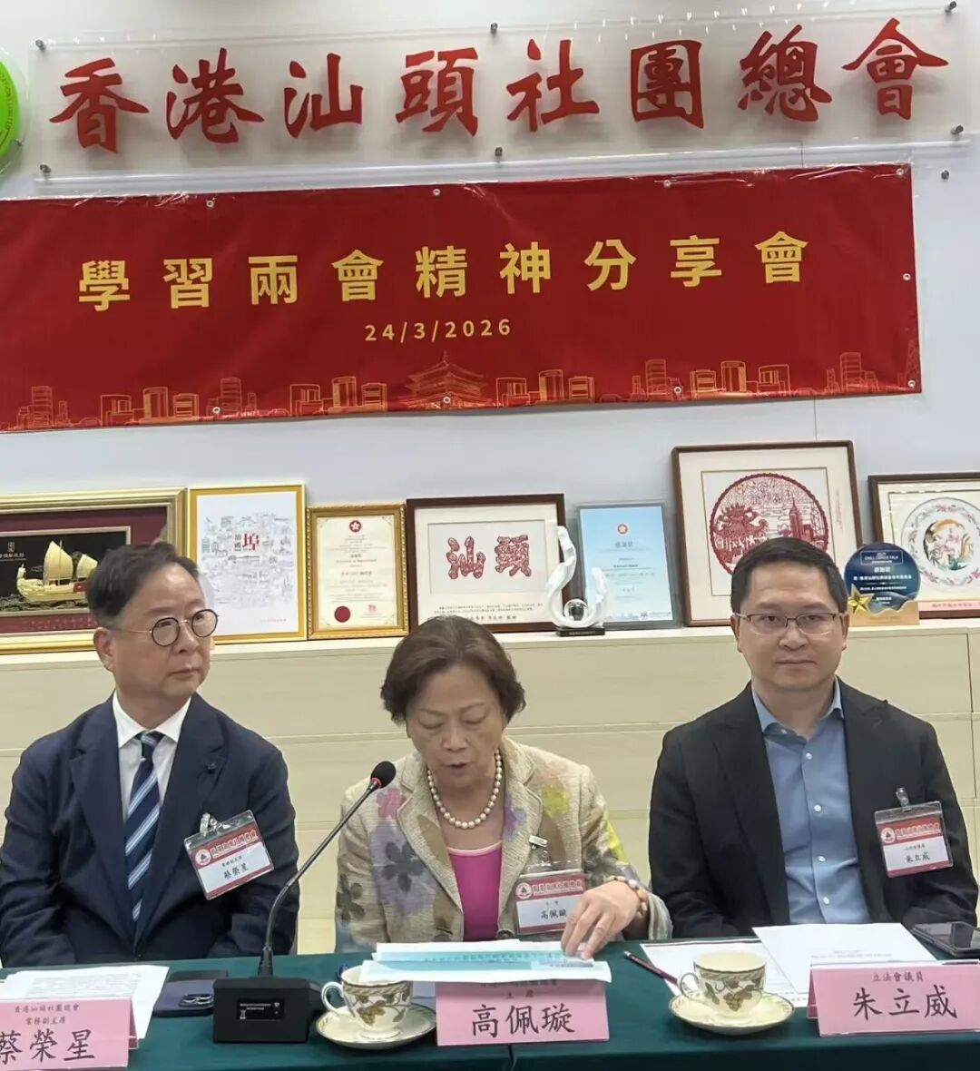 2026年3月24日,香港汕頭社團總會於本會址舉行「學習兩會精神分享會」,一眾骨幹成員踴躍出席,擔任分享主講嘉賓包括港區全國政協委員高佩璇博士、蔡榮星、陳文洲、李偉斌、胡劍江,港區人大代表朱立威