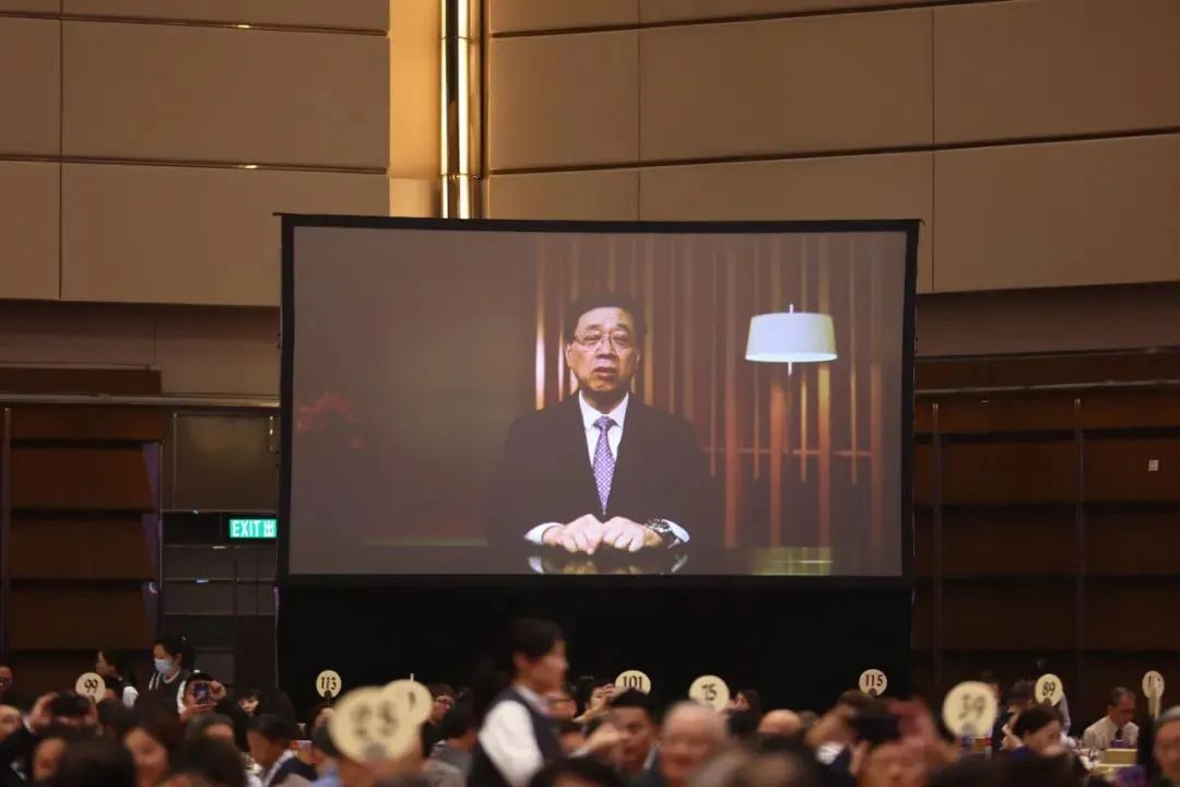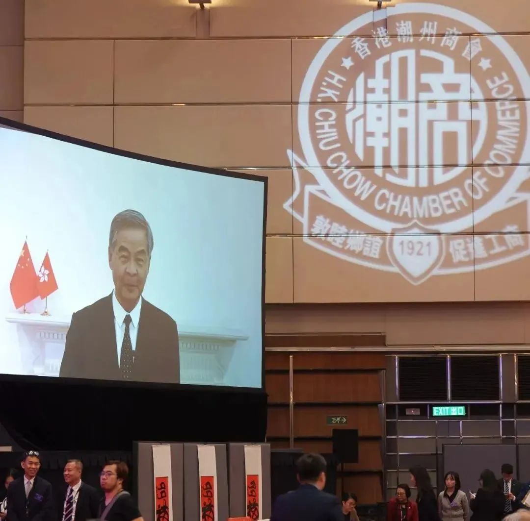 全國政協梁振英副主席發來視頻致辭祝賀,指香港潮州商會是香港一百多萬潮籍人士中最具有代表性、最具影響力、歷史最悠久的工商團體,一直堅持愛國愛港愛鄉,支持特區政府依法施政。近年來,香港潮州商會支持推進「一帶一路」和大灣區的建設,在潮籍華人、華僑眾多的「一帶一路」國家開展工作,更加有獨特的優勢。他希望香港潮州商會發揮超級聯繫人的作用,在香港及國外講好潮州故事、在潮州講好香港和國外故事,繼續為潮州與香港的共同發展、共同繁榮作出應有的貢獻。