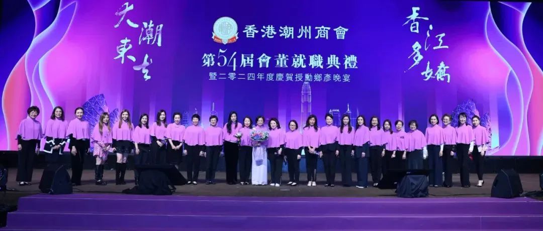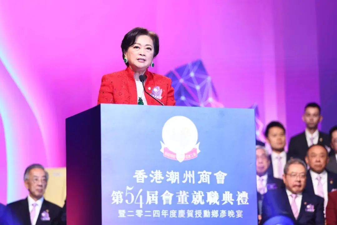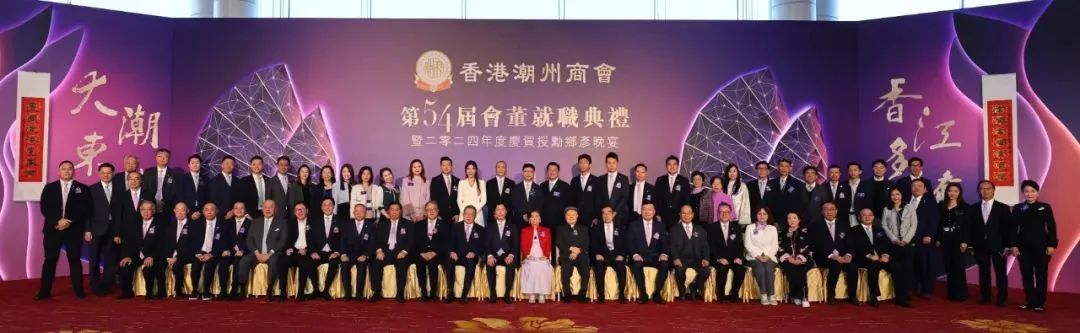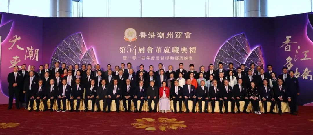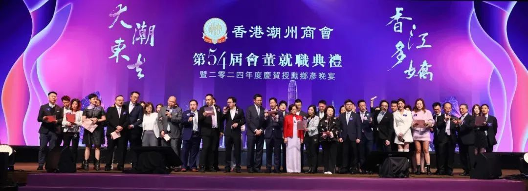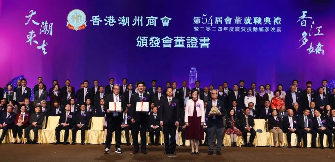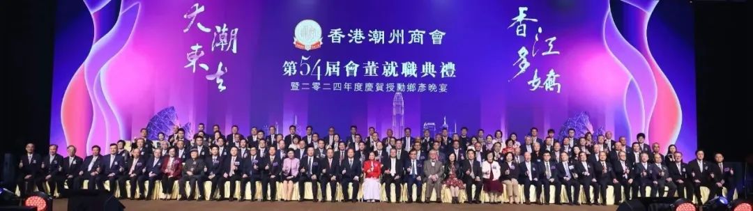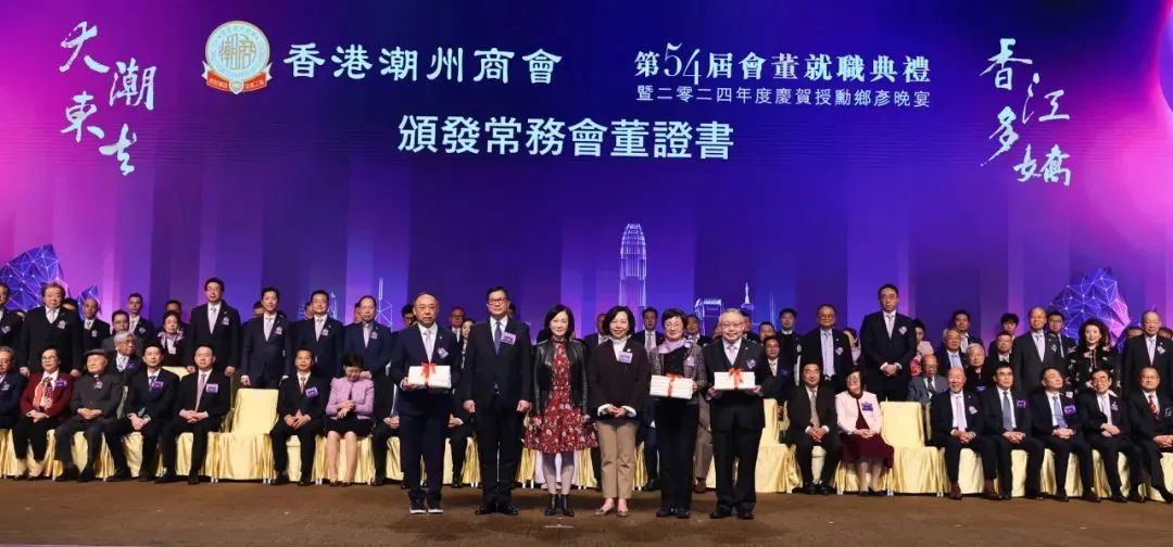 香港潮州商會第54屆會董就職典禮暨2024年度慶賀授勳鄉彥晚宴,於12月2日下午6時半,假座香港會議展覽中心新翼三樓大會堂舉行。香港特區政府李家超行政長官、全國政協梁振英副主席發來祝賀視頻,全國政協常委、港澳台僑委員會劉賜貴主任、香港特區政府財政司陳茂波司長、中聯辦劉光源副主任、前任行政長官曾蔭權先生、前任行政長官林鄭月娥女士、行政會議召集人葉劉淑儀議員、外交部駐港特派員公署方建明副特派員、駐港維護國家安全公署聯絡局謝志祥副局長、特區政府保安局鄧炳強局長、民政及青年事務局麥美娟局長,還有廣東省委統戰部郭漢毅常務副部長、廣東省委港澳工作辦公室陳麗文主任、汕頭市委溫湛濱書記、潮州市委常委統戰部莊宋太部長、揭陽市委常委統戰部姚麗璇部長等領導親臨主禮、致辭、頒發委任證書。前任行政長官曾蔭權先生、林鄭月娥女士、政務司陳國基司長、財政司陳茂波司長、律政司林定國司長、立法會主席梁君彥議員、行政會議召集人葉劉淑儀議員、本會首席榮譽主席李嘉誠先生、國務院李卓彬參事、貿發局林建岳主席、全國工商聯第九屆執委會羅康瑞副主席、香港中華總商會蔡冠深主席、香港廣東社團總會龔俊龍主席、香港潮屬社團總會陳振彬主席、四洲集團戴德豐主席、全國政協常委高永文先生、王惠貞女士等為大會題辭勉勵,全國歸國華僑聯合會、中華全國工商業聯合會、廣東省、黑龍江省、遼寧省、汕頭市、潮州市、揭陽市等政府機構及相關部門,以及海內外友好團體發來賀信。商會成員及海內外嘉賓一千多人歡聚一堂,鄉情熱情洋溢,滿場星光熠熠。會長高佩璇,副會長鄭敬凱、蔡少偉、陳強、謝錦鵬、陳建年、許平川、馬清鏗及常董、會董熱情迎候嘉賓。