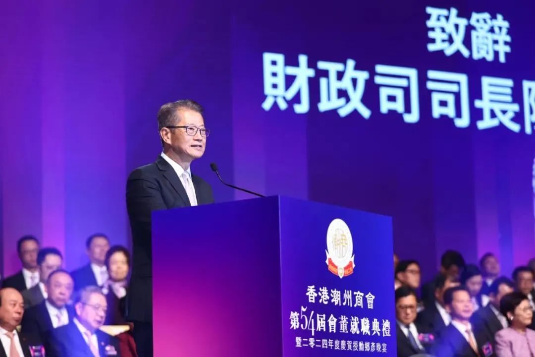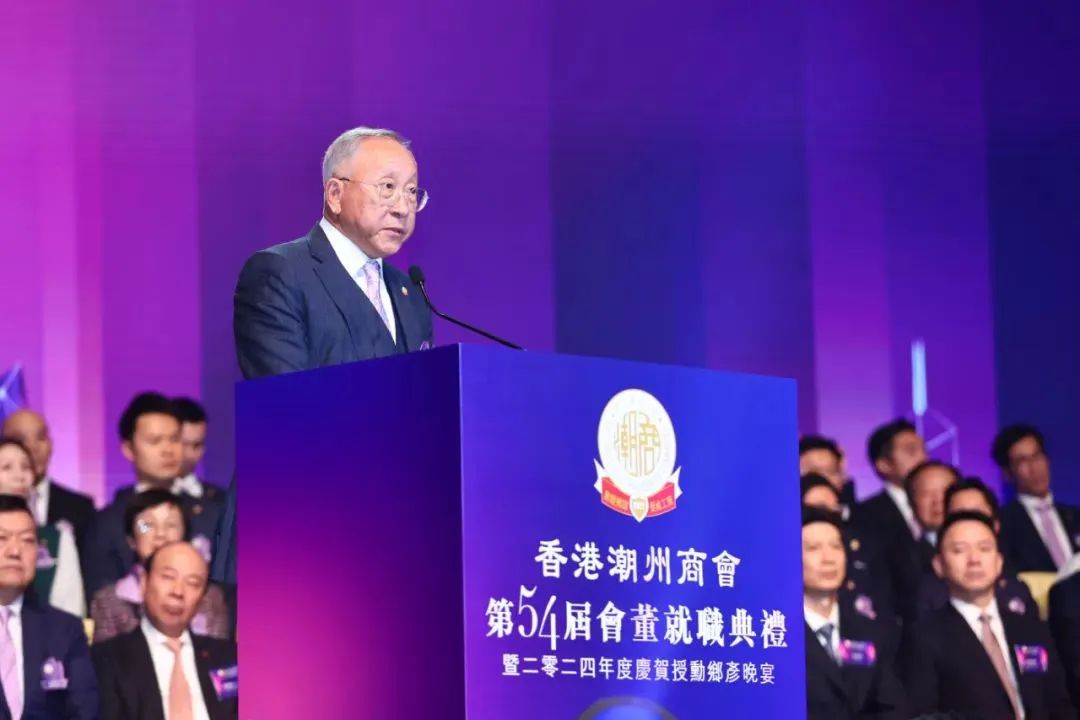 財政司司長陳茂波致辭表示,潮州人重視自己的根、鄉情濃厚、熱愛社會,多年來在為自身事業打拚的同時,也積極參與香港社會的建設,貢獻家鄉和祖國的發展。這一份從心出發的家國情懷,是大家團結奮鬥、推動社會進步的原動力,必須繼續堅持和傳承。他深信,一眾潮商潮人會繼續發揮強大的凝聚力和魄力,在各自領域盡展所長,與政府和社會各界一起推動香港經濟社會發展續創高峰。