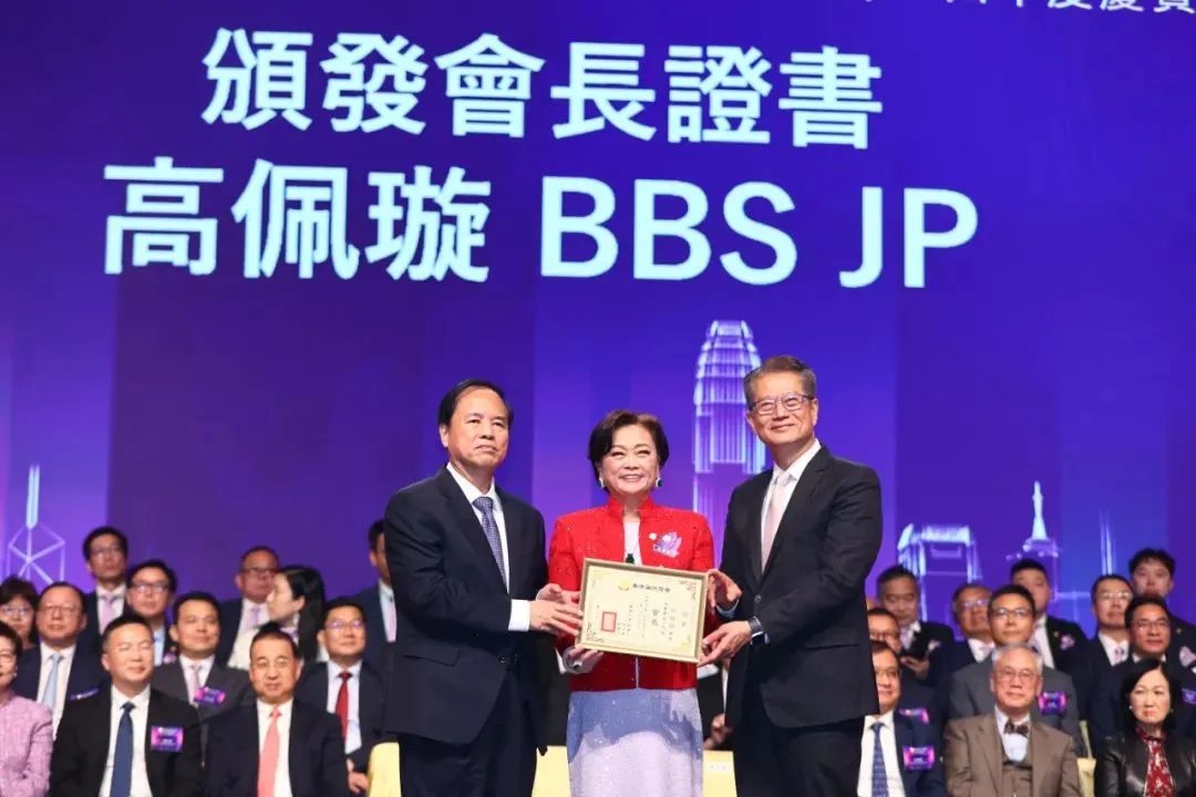 全國政協常委、港澳台僑委員會劉賜貴主任〈左〉,香港特區政府財政司陳茂波司長〈右〉頒發會長委任狀予高佩璇〈中〉