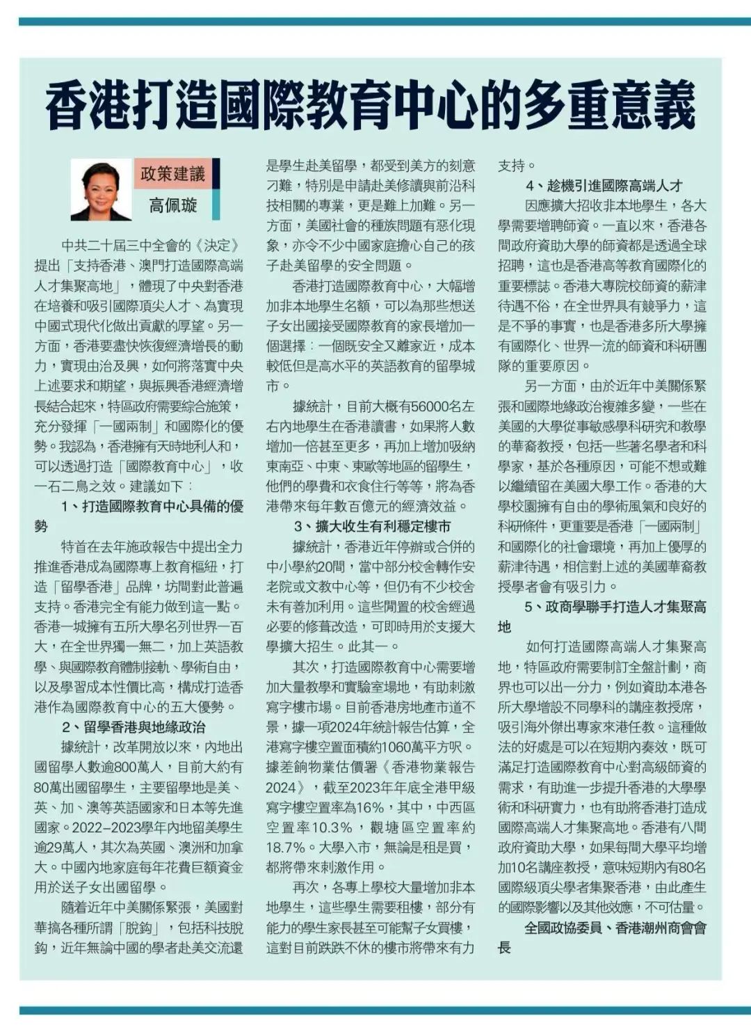 2025年3月12日《大公報》A11評論版,高佩璇:香港打造國際教育中心的多重意義