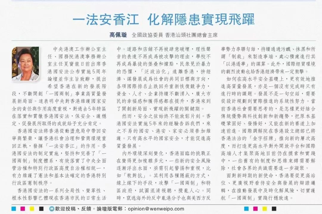 2025年 6 月 25 日《文匯報》A14版,刊登全國政協委員、香港汕頭社團總會主席 高佩璇《一法安香江 化解隱患實現飛躍》一文。