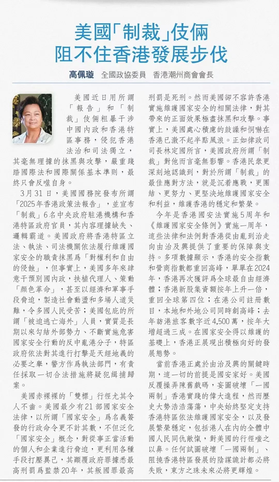 2025年 4 月 4 日《文匯報》A16版,刊登全國政協委員、香港汕頭社團總會主席 高佩璇《美國「制裁」伎倆 阻不住香港發展步伐》一文。
